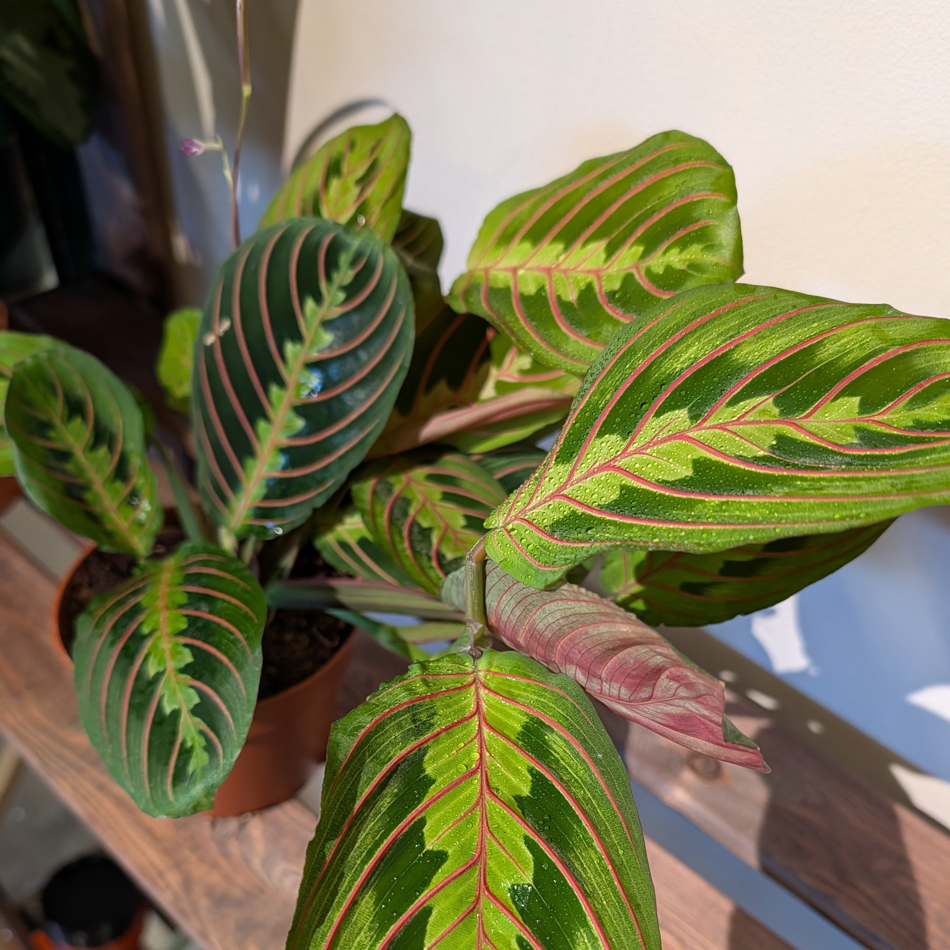 This beauty features incredible, velvety leaves marked with light green and striking red veins, with a plush, deep purple underside. But the real magic happens in the evening: as the light fades, the leaves fold upwards, like hands held in prayer, only to drop back down in the morning to catch the sun. It's a daily ritual that reminds you your plant is a living, moving friend.